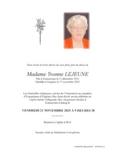 Décès de Madame LEJEUNE Yvonne (13/12/1931-17/11/2025)